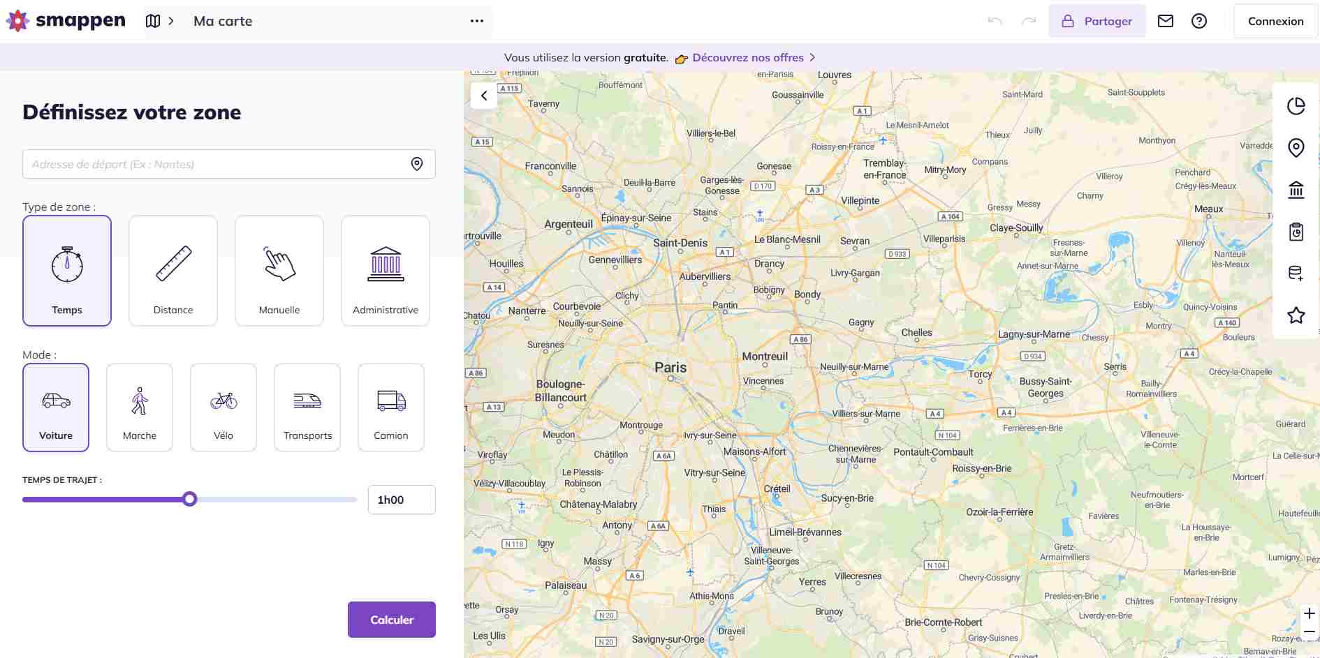 Smappen offre une création de zone de chalandise basée sur des critères réalistes et exploitables immédiatement. L’utilisateur saisit une adresse, puis choisit un mode de calcul adapté. Trois options principales existent, ce qui rend l’outil flexible et efficace selon le projet. Le calcul par temps de trajet reste le plus utilisé, car il reflète le comportement réel des clients. Une zone de 10 minutes en voiture peut couvrir 5 à 12 kilomètres selon la densité urbaine. Cette précision change totalement la lecture d’un marché local.
